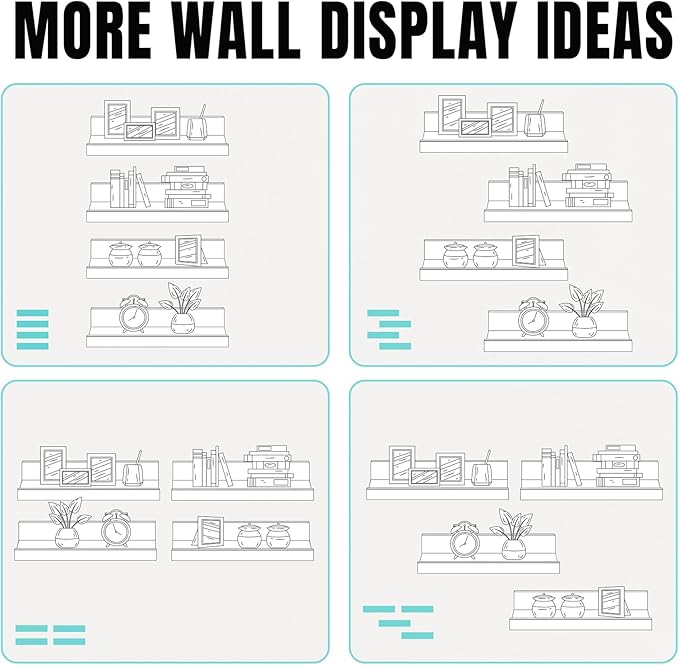 - Versatile Usage: Whether used to organize spices in the kitchen, showcase decorative pieces and photographs in the living room or bedroom, or neatly arrange toiletries in the bathroom, this shelving set excels in both storage and decoration. With four shelves included, you have the flexibility to customize their arrangement, either separately on different walls or joined together to form an elongated display